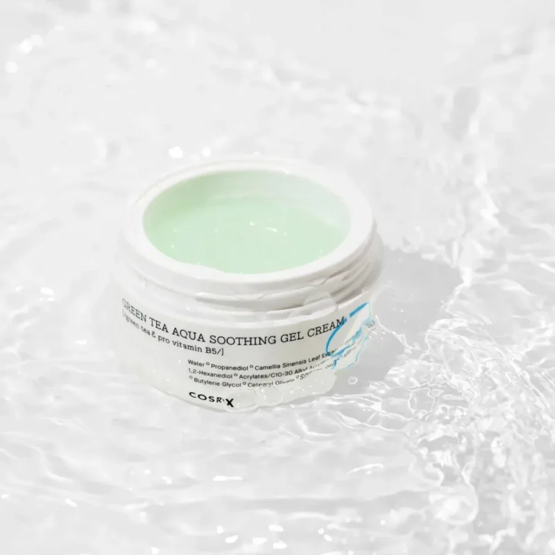 COSRX Hydrium Green Tea Aqua Soothing Gel Cream taip pat praturtintas 6-fazių hialurono rūgšties kompleksu, kuris užtikrina daugiasluoksnį drėkinimą. Hialurono rūgštis veikia kaip natūralus humektantas, sulaikantis drėgmę odos audiniuose ir suteikiantis pilnesnės, elastingesnės odos pojūtį. Šis efektas ypač aktualus dehidratuotai ar sausumo kamuojamai odai, kuri siekia greitai atgauti sveiką išvaizdą.