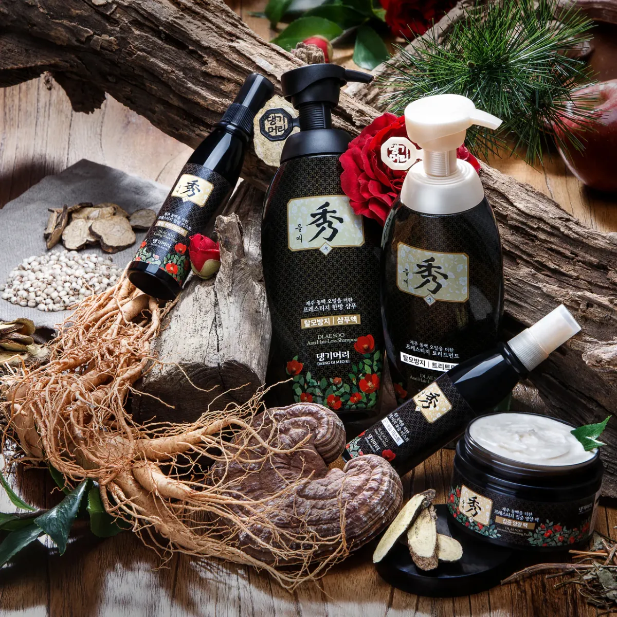 DAENG GI MEO RI Dlae Soo Hair Loss Care Shampoo – šampūnas nuo plaukų slinkimo remiasi rytietiškos žolininkystės principais ir kruopščia ekstrakcija. Pagrindas: ženšenio šaknies (Panax ginseng) saponinai, žinomi dėl gebėjimo skatinti mikroapytaką ir gerinti folikulų trofiką. Angelikos (Angelica gigas) ir rehmnijos (Rehmannia glutinosa) ekstraktai ramina sudirgusią odą, o saldymedis (Glycyrrhiza glabra) su glikirizino rūgštimi padeda mažinti diskomfortą bei paraudimą. Žaliosios arbatos polifenoliai veikia kaip antioksidantai: saugo nuo oksidacinio streso, kuris dažnai siejamas su trapumu ir difuziniu slinkimu.