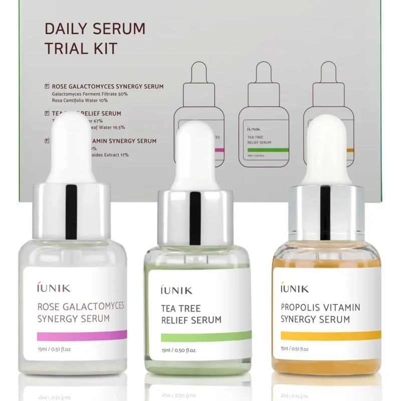 Iunik Daily Serum Trial Kit – puikus pasirinkimas tiems, kurie ieško galimybės išbandyti kelis serumus ir atrasti, kuris geriausiai atitinka jų odos poreikius. Universalus dydis leidžia pasidžiaugti šio rinkinio pranašumais tiek namuose, tiek kelionėse.