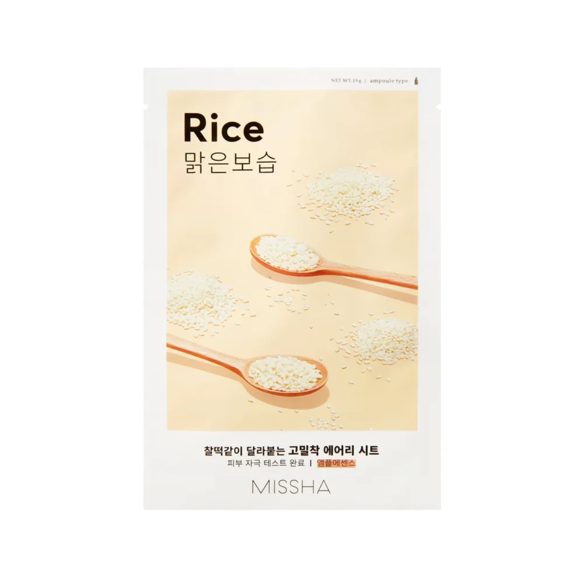 Ryžių ekstraktas – natūralus drėkiklis, pasižymintis gebėjimu skatinti odos švytėjimą bei ilgalaikį drėgmės išlaikymą. Polisacharidai ir amino rūgštys, esantys ryžių ekstrakte, padeda sustiprinti odos barjerą ir sumažinti dehidratacijos požymius. MISSHA Airy Fit Sheet Mask Rice naudoja fermentuotų ryžių ekstraktą, užtikrinantį aukštesnį bioprieinamumą: veikliosios medžiagos efektyviau pasiekia giliuosius odos sluoksnius.